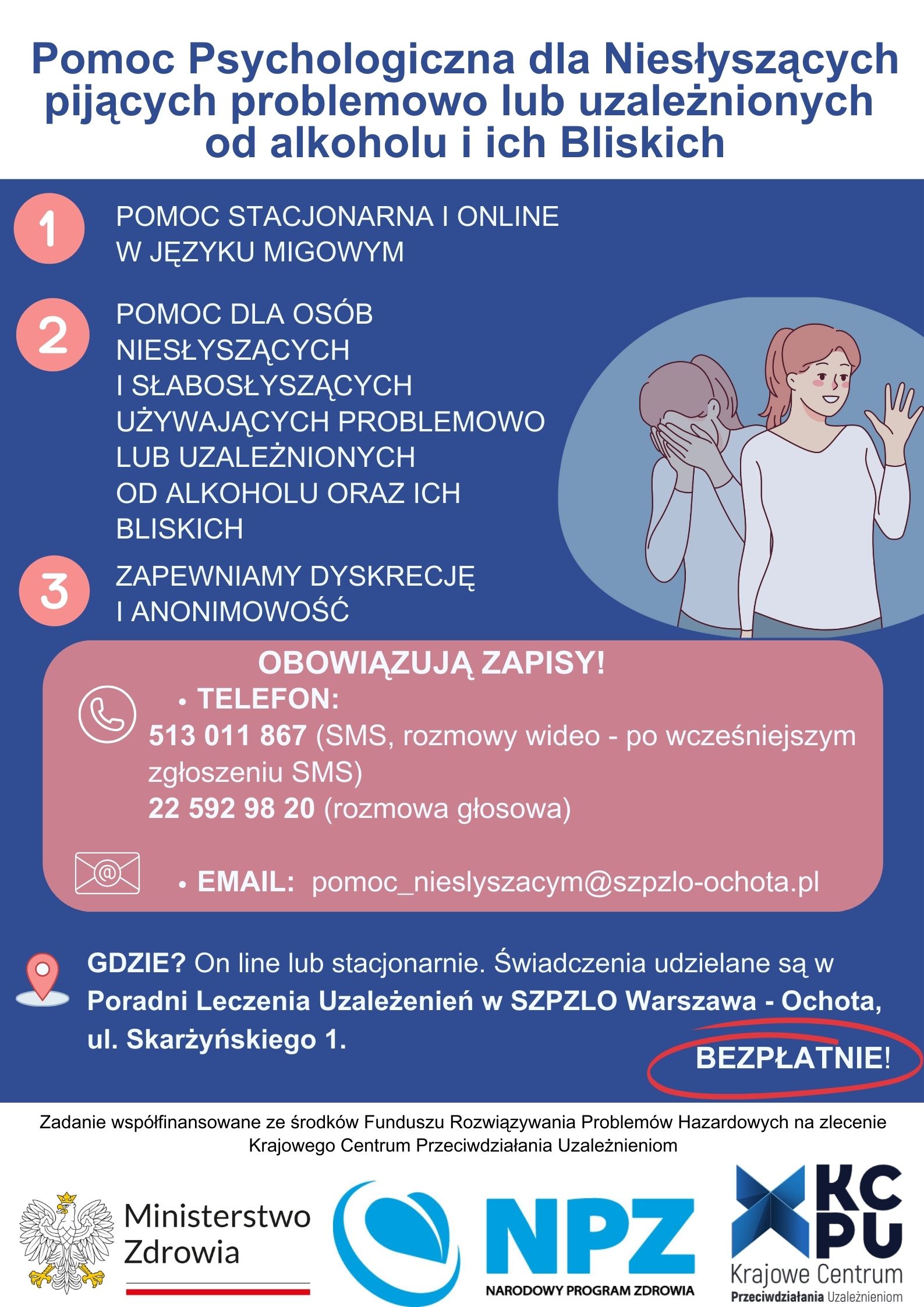 3) telefonicznie lub mailowo dla osób słyszących: nr tel.: 22 592 98 20 lub mail: uzaleznienia.skarzynskiego@szpzlo-ochota.pl