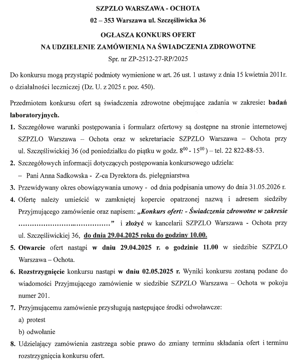 Konkurs ofert na świadczenia zdrowotne ***badań laboratoryjnych.