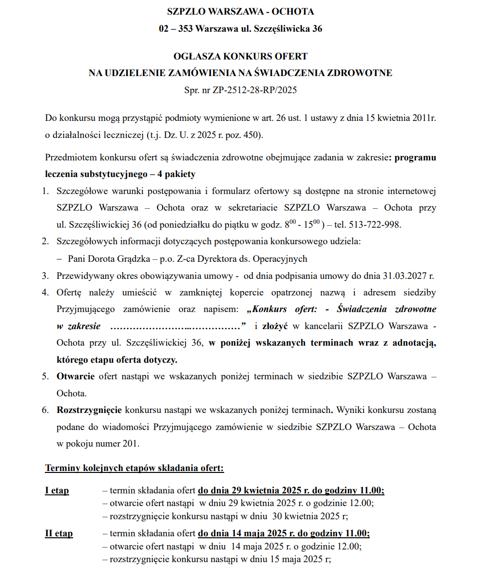 Konkurs ofert na świadczenia zdrowotne w zakresie programu leczenia substytucyjnego (4 pakiety)