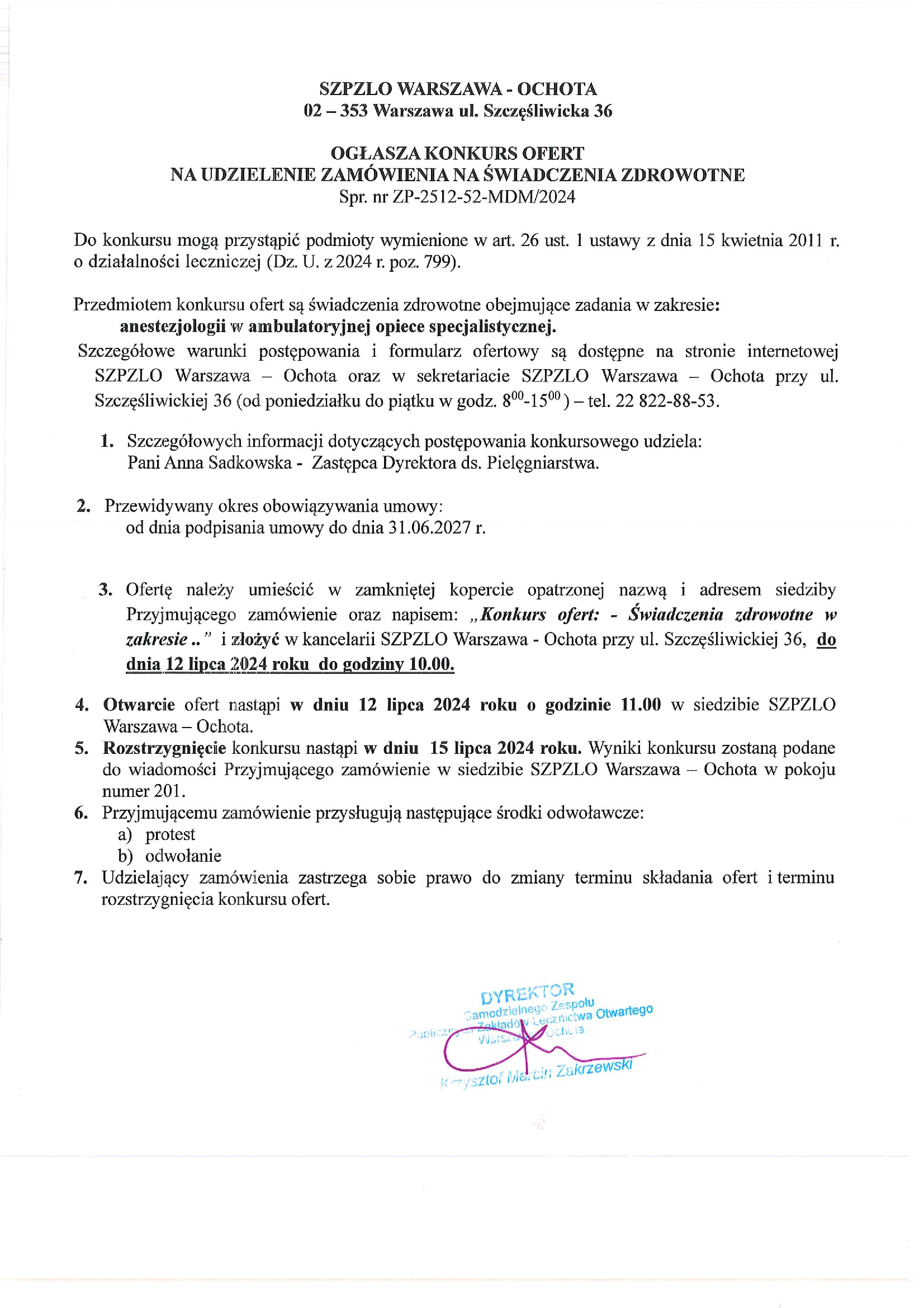 KONKURS OFERT NA UDZIELENIE ZAMÓWIENIA NA ŚWIADCZENIA ZDROWOTNE w zakresie: anestezjologii w ambulatoryjnej opiece specjalistycznej
