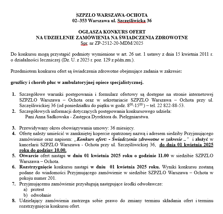 KONKURS OFERT NA UDZIELENIE ZAMÓWIENIA NA ŚWIADCZENIA ZDROWOTNE w zakresie: gruźlicy i chorób płuc w ambulatoryjnej opiece specjalistycznej