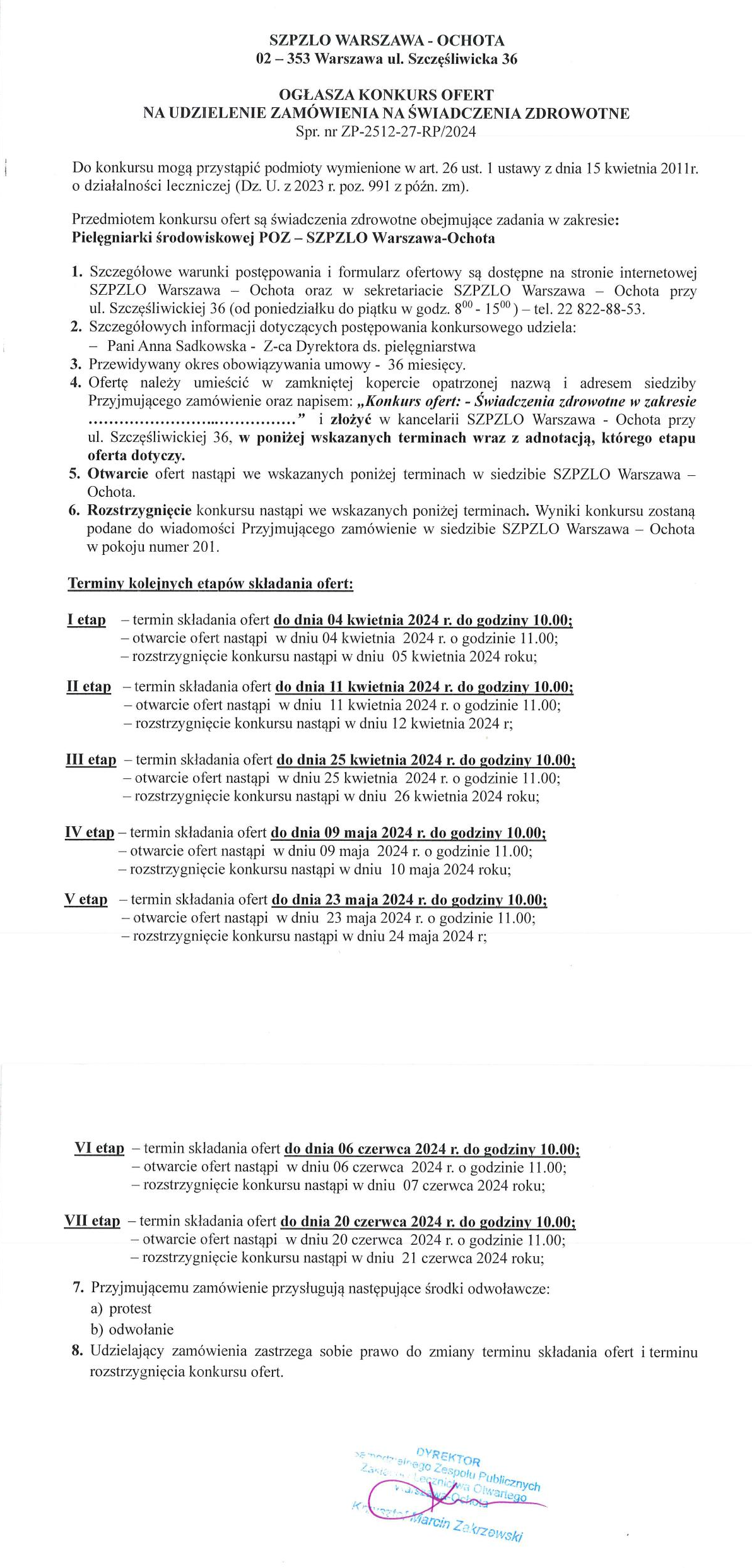 KONKURS OFERT NA UDZIELENIE ZAMÓWIENIA NA ŚWIADCZENIA ZDROWOTNE w zakresie: pielęgniarki środowiskowej POZ (ZP-2512-27-RP/2024)