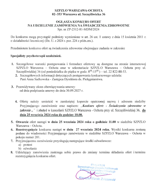 KONKURS OFERT NA UDZIELENIE ZAMÓWIENIA NA ŚWIADCZENIA ZDROWOTNE w zakresie: Specjalisty psychoterapii uzależnień (Nr ZP-2512-81-MDM/2024)