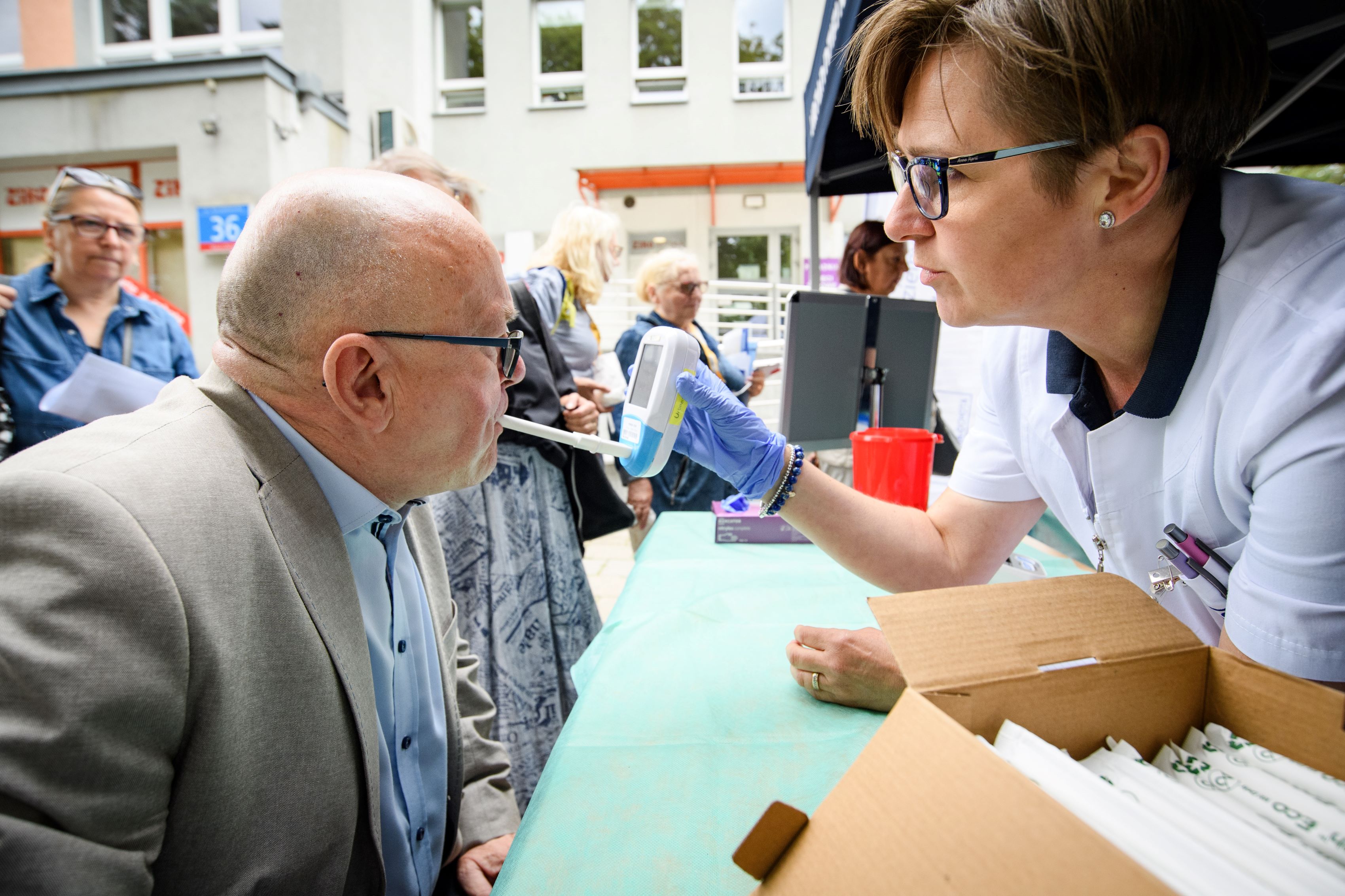 - Punkt SZPZLO Warszawa - Ochota, w którym dużym zainteresowaniem cieszyło się badanie poziomu glukozy i badanie przy użyciu Smokolajzera, urządzenia szczególnie dedykowanego dla palaczy, którego celem jest sprawdzenie poziomu CO w wydychanym powietrzu. Z badania Smokolajzerem i badania ciśnienia krwi skorzystało blisko 100 osób. Dodatkowo edukowaliśmy się w przedmiocie badania piersi i jąder;