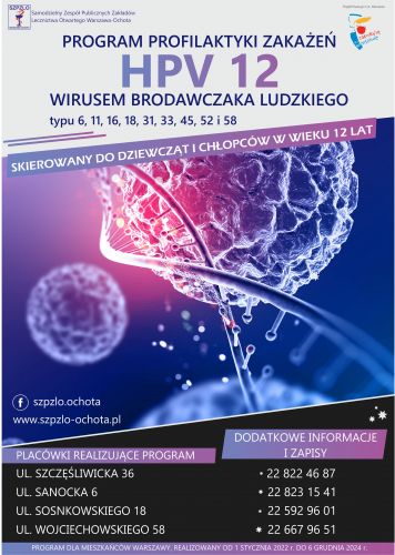 informujemy, że po raz kolejny przystąpiliśmy do realizacji programu w zakresie profilaktyki zakażeń wirusem brodawczaka ludzkiego pn. „HPV 12”. Szczepienia ochronne wykonywane w ramach programu skierowane są do dziewcząt i chłopców w wieku 12 lat, zamieszkałych na terenie m. st. Warszawy.