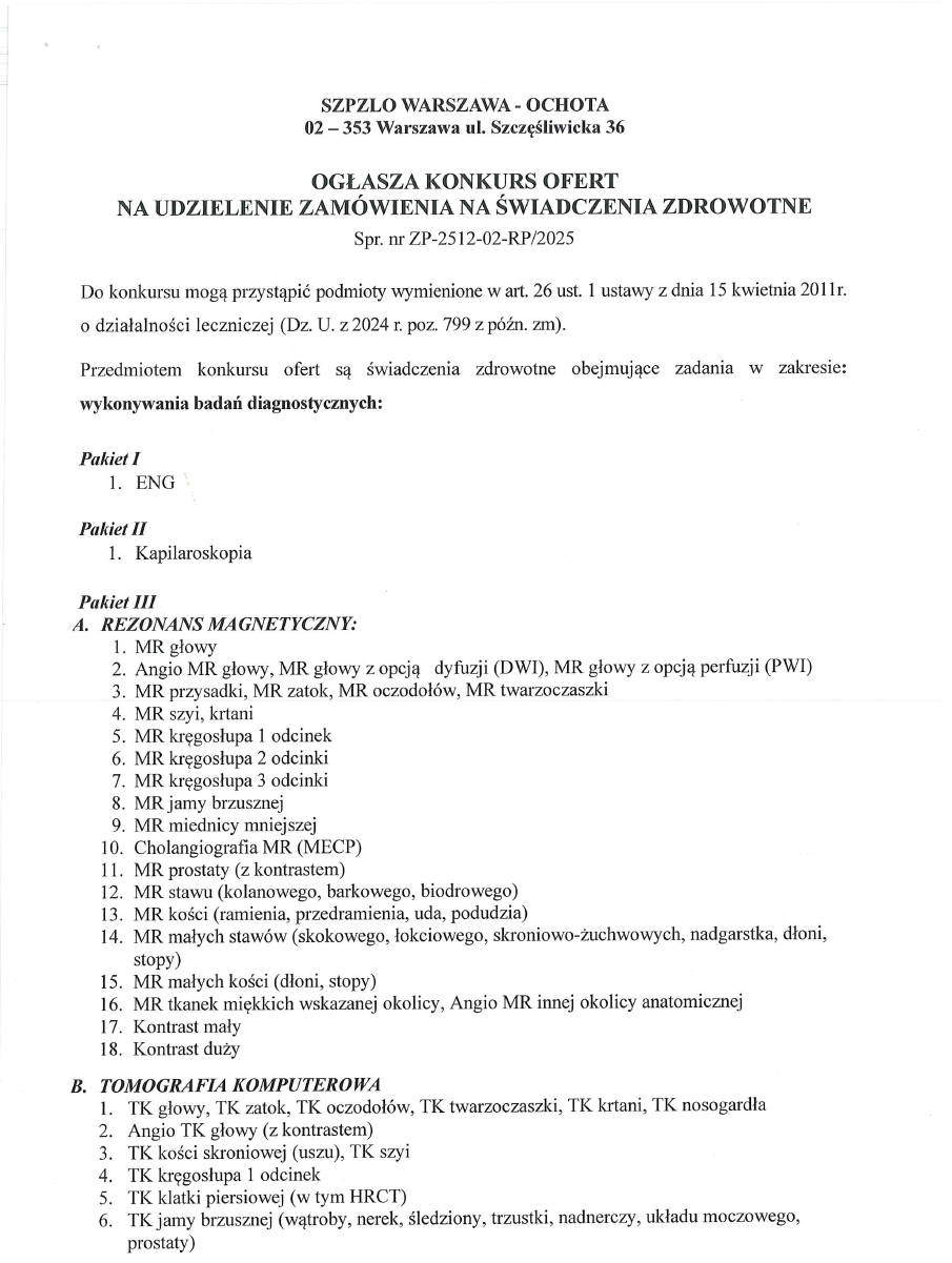 Przedmiotem konkursu ofert są świadczenia zdrowotne obejmujące zadania w zakresie: badań diagnostycznych nr ZP-2512-02-RP/2025