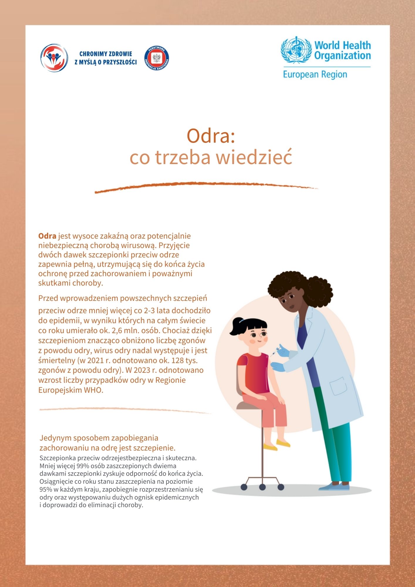 Szczepienia pomagają zapobiegać rozprzestrzenianiu się chorób zakaźnych i chronią osoby najbardziej narażone – dzieci, seniorów oraz osoby z obniżoną odpornością. Dzięki nim wiele niebezpiecznych chorób zostało ograniczonych lub niemal całkowicie wyeliminowanych. Sprawdź dostępne materiały edukacyjno-informacyjne i bądź świadomy – rzetelna wiedza to pierwszy krok do odpowiedzialnej troski o zdrowie swoje i innych.
