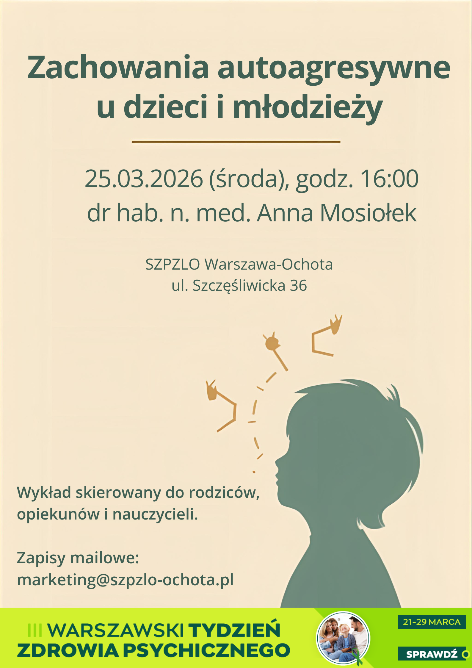 W ramach III edycji Warszawskiego Tygodnia Zdrowia Psychicznego zapraszamy na wykład dla rodziców, opiekunów i nauczycieli.