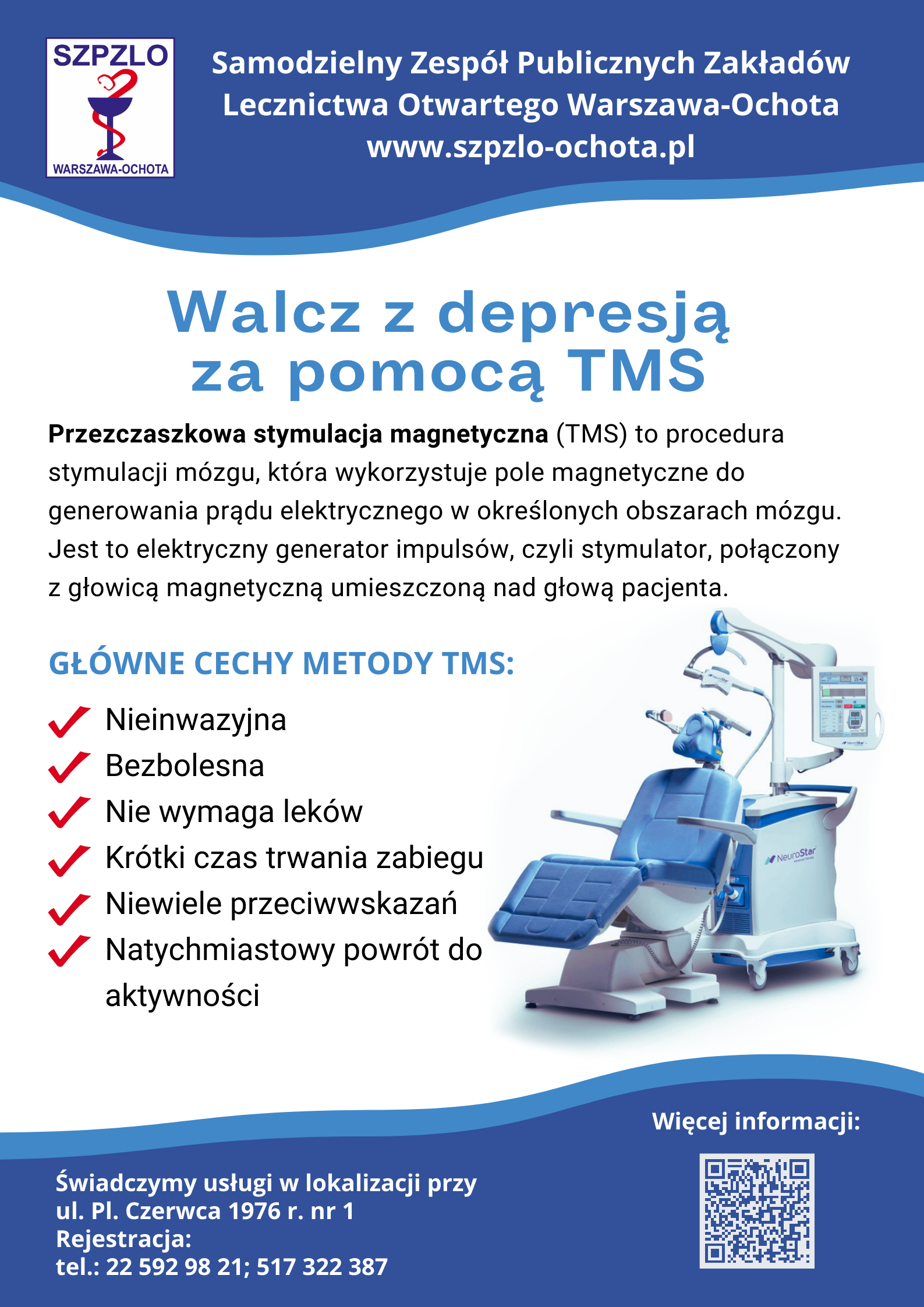 At SZPZLO Warszawa-Ochota we offer one of the latest treatment methods in the field of neurology and psychiatry - transcranial magnetic stimulation (TMS). It is a modern, non-invasive method of brain stimulation that uses short magnetic pulses to induce electric currents.