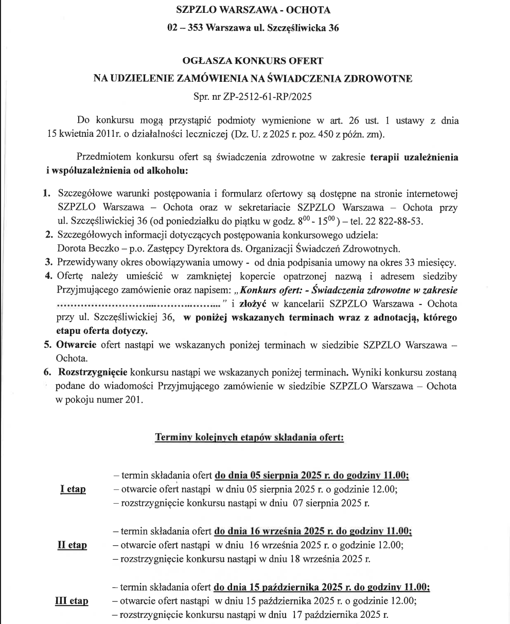Konkurs ofert na świadczenia zdrowotne w zakresie erapii uzależnienia i współuzależnienia od alkoholu (ZP-2512-61-RP/2025)