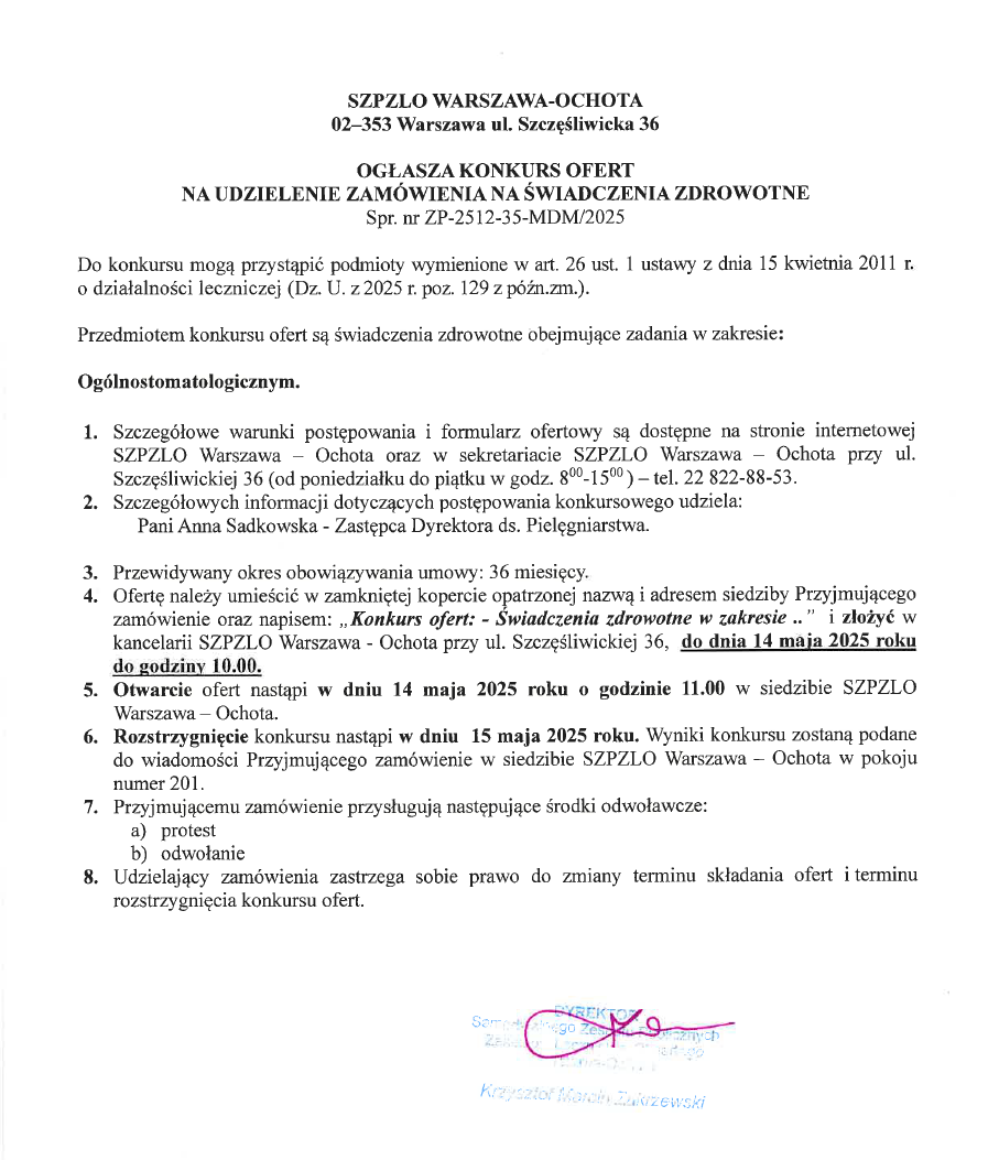 KONKURS OFERT NA UDZIELENIE ZAMÓWIENIA NA ŚWIADCZENIA ZDROWOTNE w zakresie: ogólnostomatologicznym (Nr ZP-2512-35-MDM/2025)