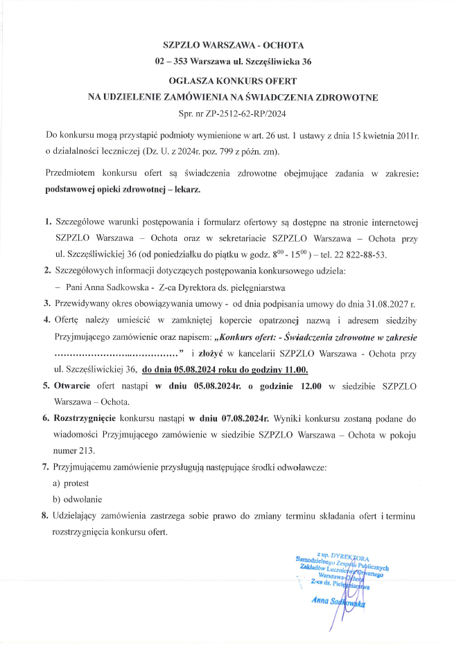 KONKURS OFERT NA UDZIELENIE ZAMÓWIENIA NA ŚWIADCZENIA ZDROWOTNE w zakresie: podstawowej opieki zdrowotnej - lekarz (ZP-2512-62-RP/2024)