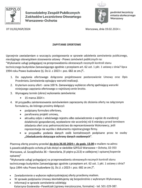 Wykonanie usługi polegającej na przeprowadzeniu okresowych rocznych kontroli stanu technicznego budynków