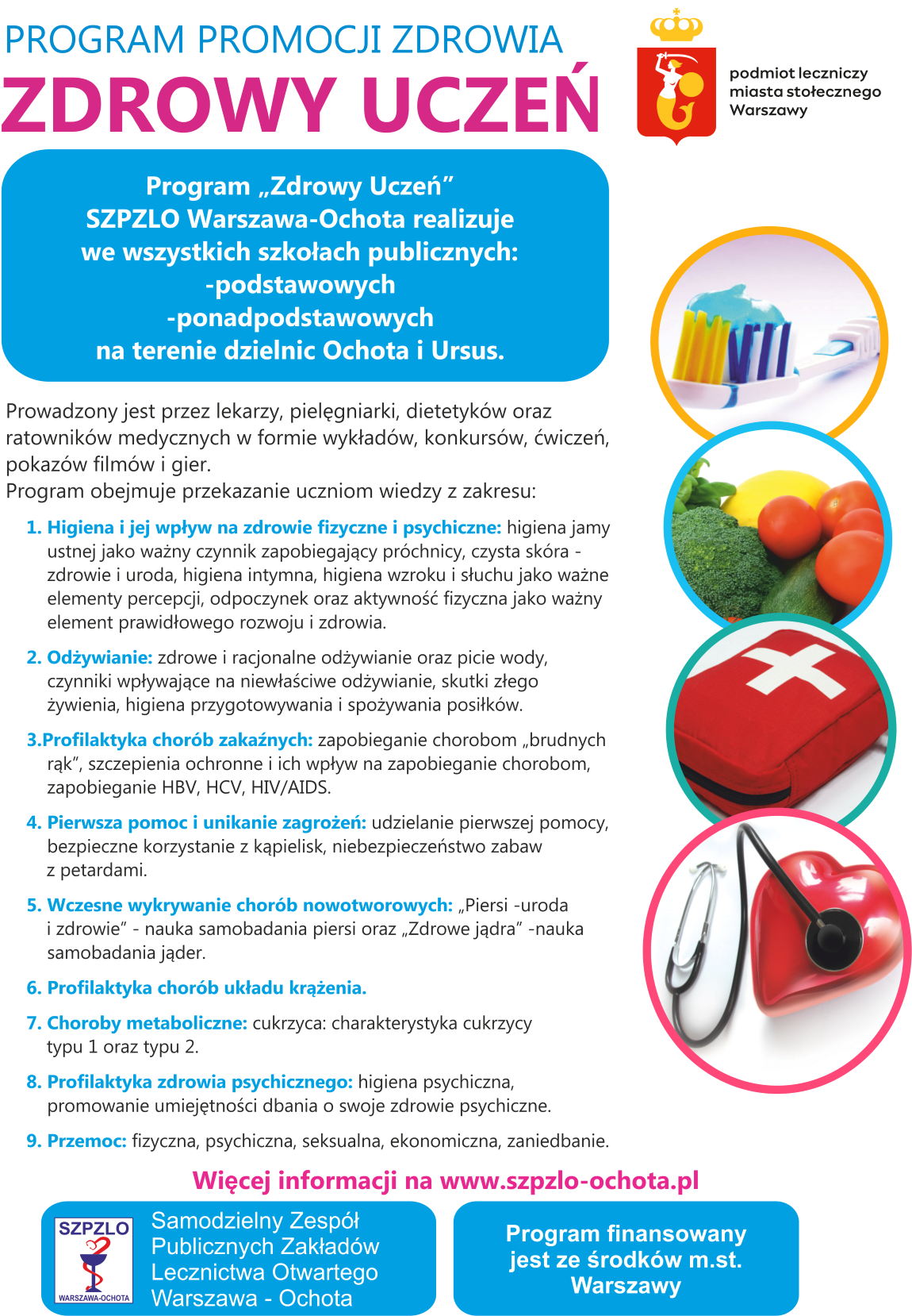 Program „Zdrowy Uczeń” ma za zadanie rozpowszechnianie działań z zakresu promocji zdrowia wśród uczniów. Zdrowie jest nieodłącznym warunkiem osiągnięć szkolnych i dobrej jakości życia. Pożądane postawy i nawyki kształtowane są poprzez zdobywanie wiedzy o zdrowiu oraz umiejętności. Program kierowany jest do dzieci i młodzieży uczęszczających do szkół publicznych, dla których m.st. Warszawa jest organem prowadzącym, tj. szkół podstawowych i ponadpodstawowych.